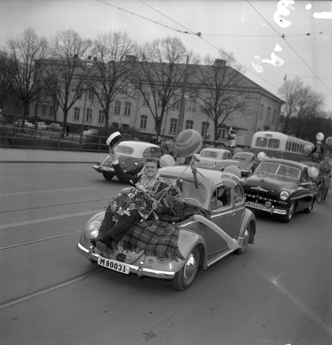 Student på motorhuv av personbil. Amiralsbron Latinskolan