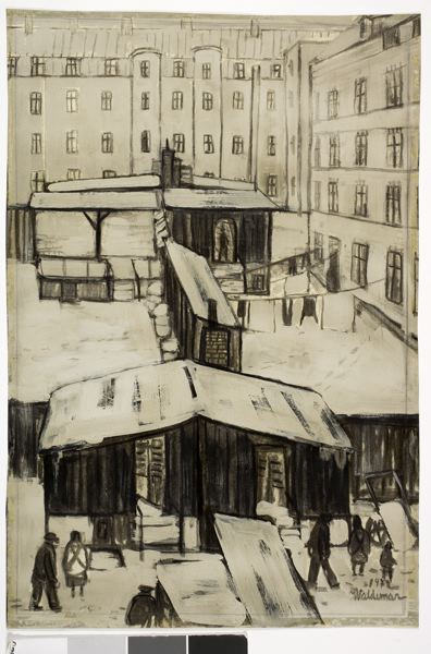 - Vi befinner oss på gården till Hagagatan 6-8 på Möllevången. Motivet är sett från ett fönster någon våning upp och ger en utblick över gårdarna i kv Konrad. Parallellt med bildplanet ser vi plank och gårdsbyggnader som avgränsar kvarterstomterna. I fonden ser vi gårdssidan av ett fyravånings bostadshus som sträcker sig tvärs över bilden och mot höger bildkant fortsätter i rät vinkel mot betraktaren. Som titeln anger är det vinter, teckningen är gjord med svart ritkol och alla ytor som är snöbelagda är övermålade med vit gouache som färgas grå av underliggande ritkol och ger ett kärvt och stadssmutsigt intryck. Nederst i bilden ser vi ett halvt dussin människor röra sig på den närmsta gårdsplanen framför utedass och gårdsbyggnader. På mellangården ser vi till höger tvätt hängande på tvättstreck och fotspår i snön. Den tredje och bortersta gården ligger skymd bakom gårdsbyggnader och plank.