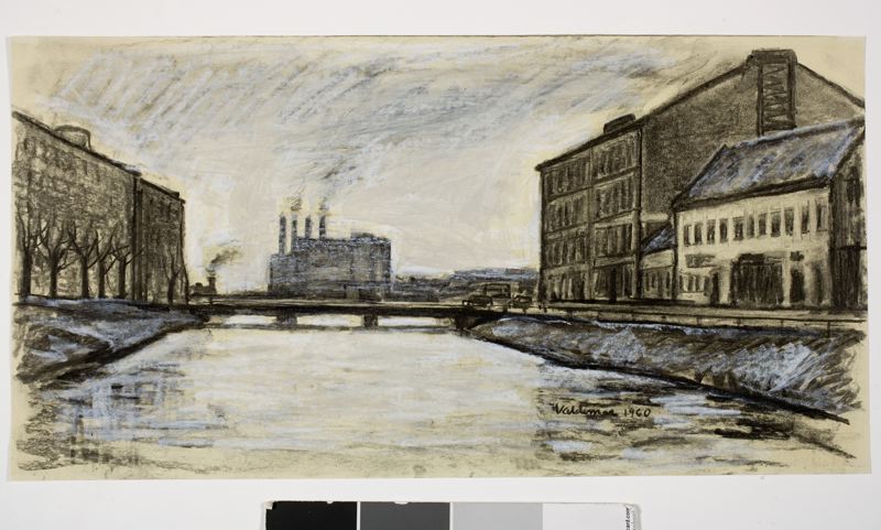 - Vi befinner oss på Carolibron som förbinder Gamla Staden med Östra Förstaden och vi vänder blicken mot nordväst och Schougens bro. Kanalen sträcker sig över hela nedre kantens bredd. T.v. ser vi strandlinjen utmed Östra Promenaden och bebyggelsen i kv Utanverket, Husaren och Dragonen. T.h. ser vi strandlinjen utmed Exercisgatan och bebyggelsen i kv Axel. Bortom Schougens bro skymtar man järnvägsområdets och hamnens bebyggelse, i mitten en jättelik byggnad med fyra rykande skorstenar, det s.k. Nyhamnsverket, dvs Sydkrafts gamla ångkraftverk vid Jörgen Kocksgatan/Grimsbygatan som revs 1983.