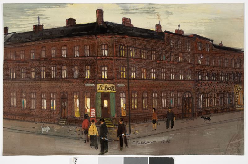 - Vi befinner oss i hörnet Sofielundsvägen / Claesgatan på Möllevången och vänder blicken åt sydost. Vi ser hörnhuset i kv Leonard med Sofielundsvägen till vänster och Claesgatan till höger. Huset är uppfört i rött tegel i tre våningar och har tak av svart tjärpapp. På den avfasade hörnan finns entrén till en liten tobaksaffär med skyltfönster runt hörnan och det lyser ett starkt gult ljus i fönstren. På trottoaren och gatan utanför syns ett halvt dussin människor och ett par hundar. En kvällshimmel lägrar sig över hustaken.