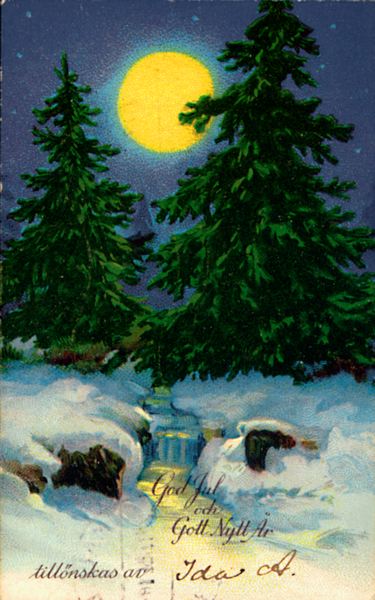 - Julkort, Nyårskort, tryck på kartong. Motiv föreställande vinterlandskap i skogen om natten med fullmåne. Tryck text på framsida; Glad Jul och gott Nytt År tillönskas av Ida A. Handskrift på baksida. Poststämplat i Malmö 1931.