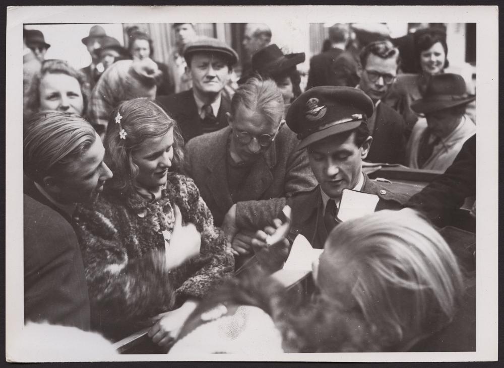 engelsmän, kvinna, autograf, folksamling, världskriget, engelsman, man, autografer, amerikan, amerikaner, danmark, män, militär, soldater, kvinnor, soldat, militärer, andra