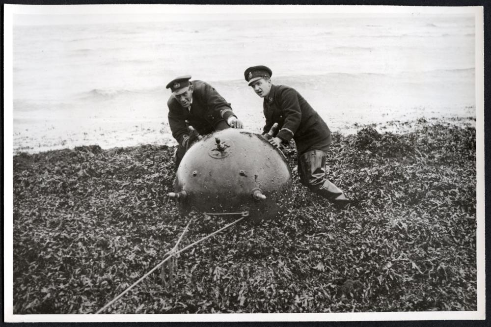 - Minfaran vid skånekusten. Många minor driva utanför den skånska kusten och komma småningom in mot stränderna. Bilden visar land vid Böste, dragas upp på stranden för att desameras.