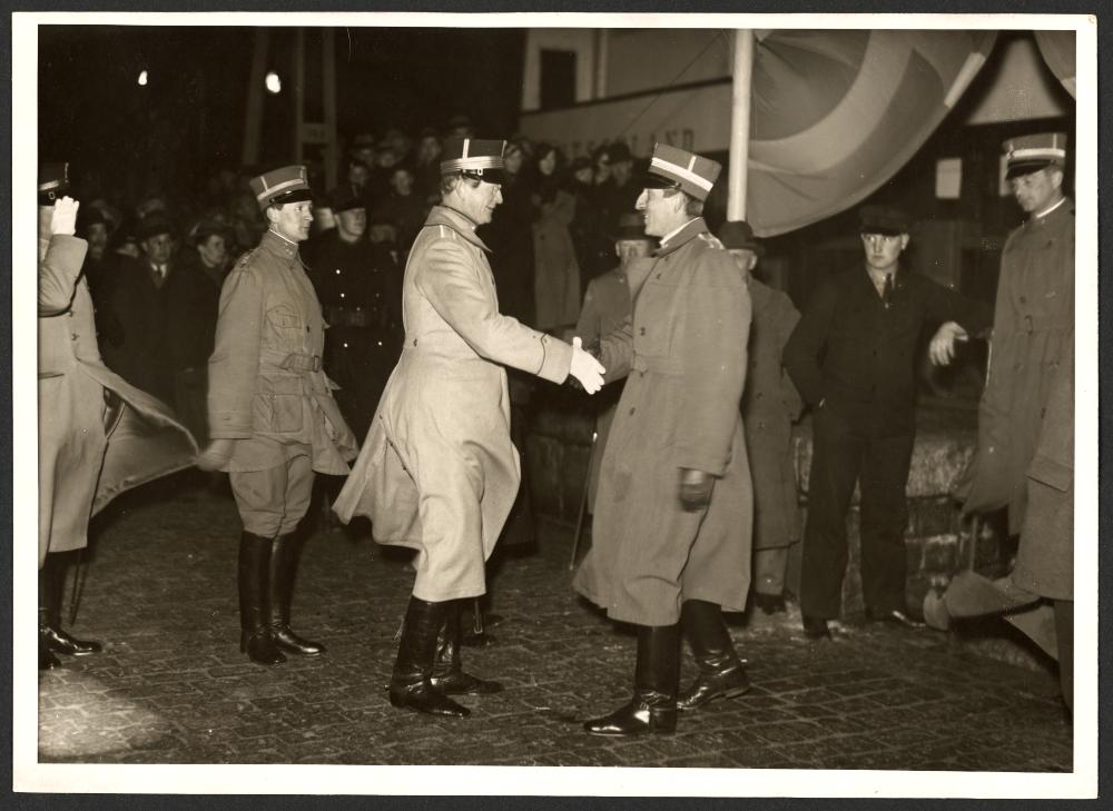 - Saarbataljonens återkomst. Från mottagandet i Trelleborg. Den första välkomsthälsningen, överste Winberg hälsar Saarbataljonens chef överstelöjtnant Nordenswahn välkommen hem