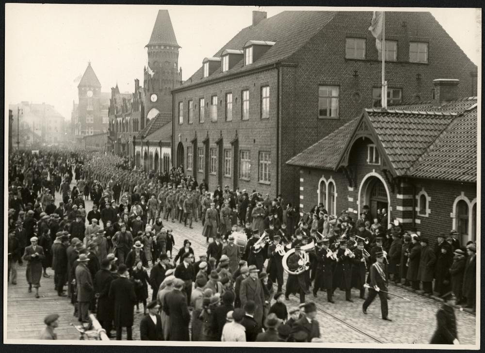 Saarbataljonens avresa. På marsch mot ångfärjelägret i Trelleborg.