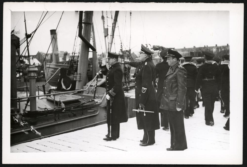 - Tyska besättningen från Trelleborg. Ett tyskt örlogsfartyg hämtade på tisdagen den vid Böste havererade besättningen samt deras omkomna kamrater. - Under militära hyllningar fördes kistorna ombord. T.h. befälhavaren på det grundstötta fartyget samt tyske konsult i Malmö och chefen för Öresunds Marindistrikt, kommendörkapten Graaf.