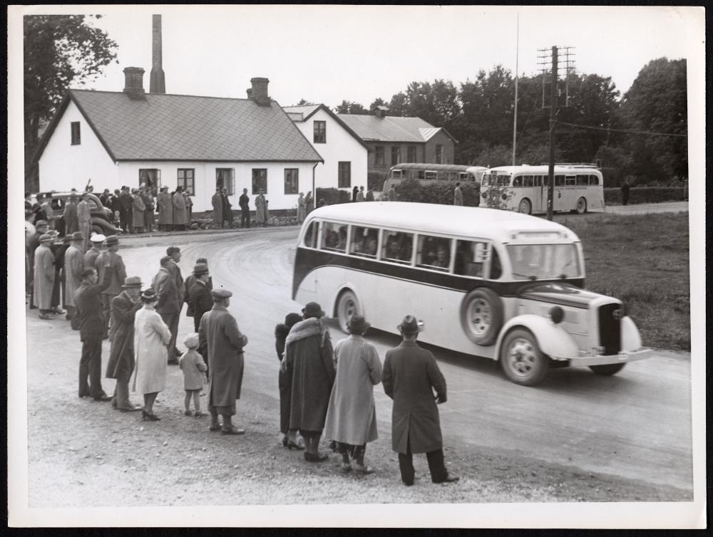 Smålandsmanövern. Södra Skåningarnas avfärd till krigsskåde platsen. Bilkolonen passerar Rolsberga.