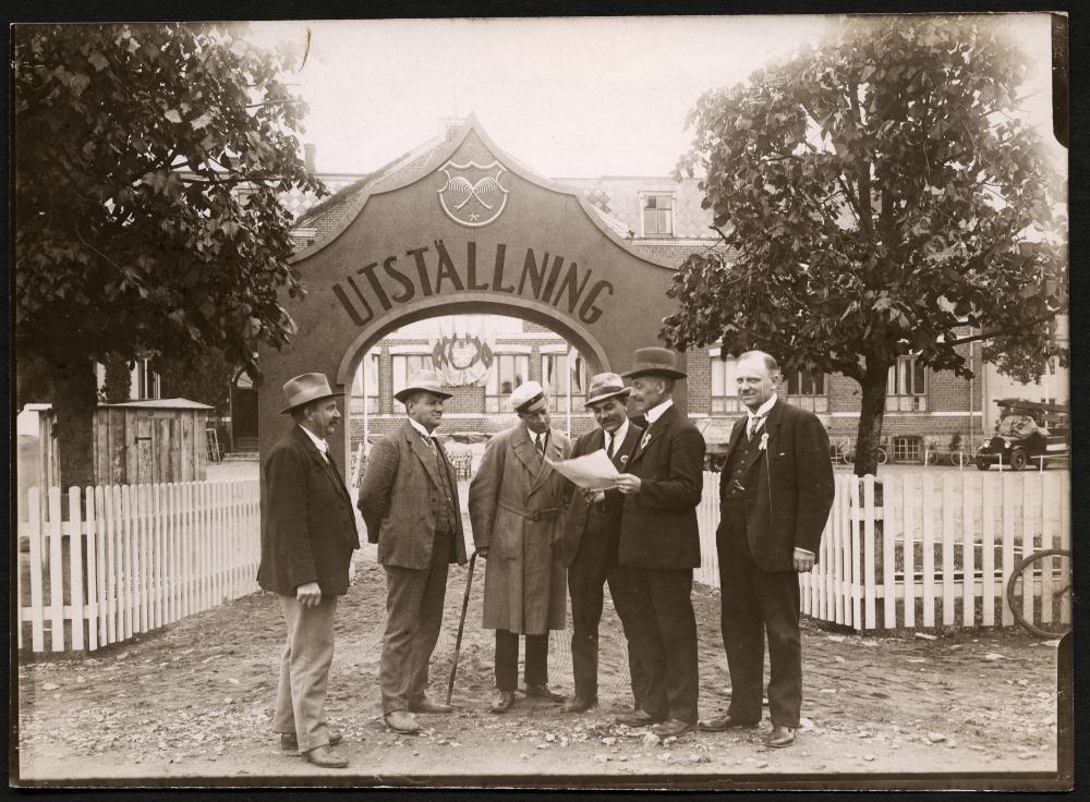 Textil och hemslöjdsutställning i Osby. Utställnings styrelse vid entrén till utställningen på samskolan.