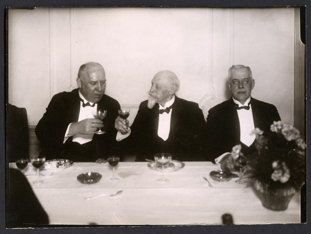 Skånska bankjubileet. Från festmiddagen på Continental i Ystad fr. v. Landshövding Johan Nilsson och 86- årige länsjägmästaren Eugène Hemberg.
