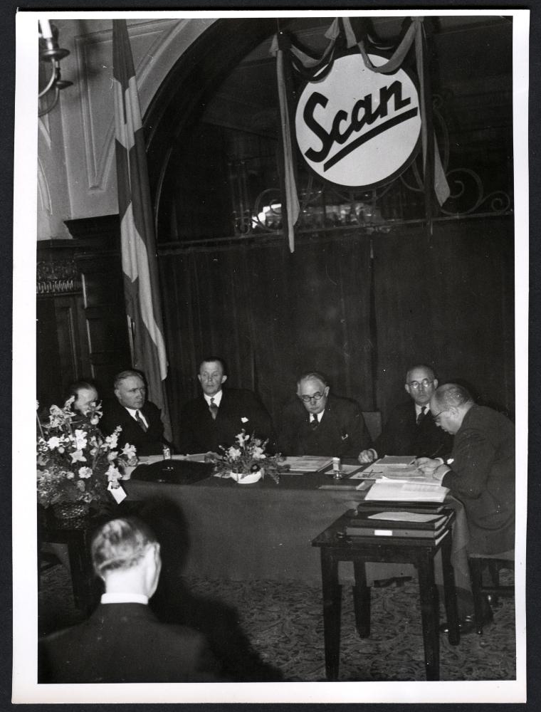 - Scans 10-årsjubileum. Föreningen Skånska Andelsslakterier friande på lördagen sin 10-åriga tillvara vid en högtidsammankomst på Grand Hotell i Lund, - Bilden visar presidiet med i mitten dagens ordförande, Statsrådet Bramstorp.