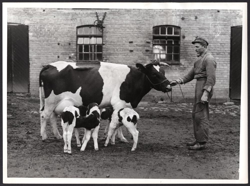 - Kalv-trillingar. En ovanlig händelse har inträffat hos en lantmästare G.Silverberg. Hoby boställe, Krutmöllan, i det en kon nedkommit med tre jämnstora kalvar - två tjurkalvar och en kvigkalv. - Bilden visar den lyckliga modern, nr 192 Blanka, med sina trillingar. Zoologi kuriösa.