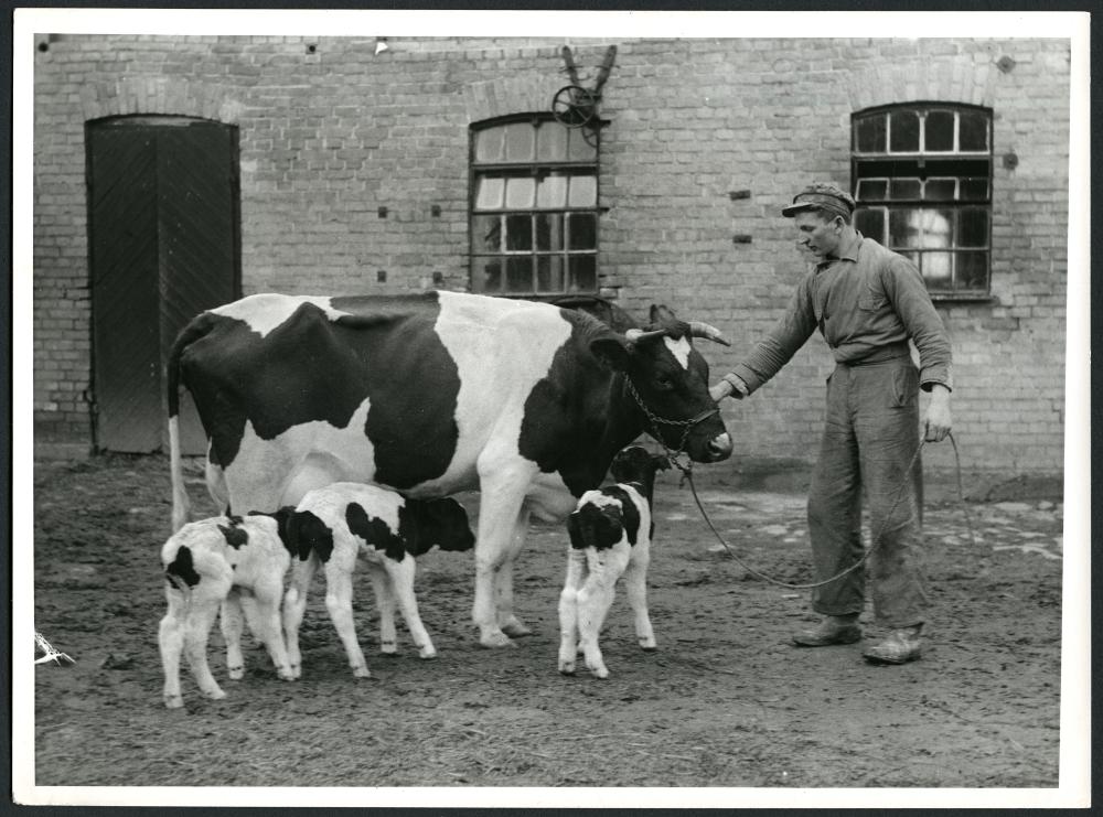 - Kalv-trillingar. En ovanlig händelse har inträffat hos en lantmästare G.Silverberg. Hoby boställe, Krutmöllan, i det en kon nedkommit med tre jämnstora kalvar - två tjurkalvar och en kvigkalv. - Bilden visar den lyckliga modern, nr 192 Blanka, med sina trillingar. Zoologi kuriösa.