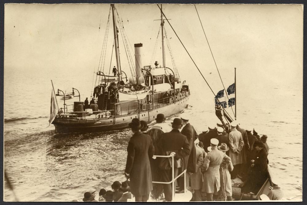 Malmö- och lundabor ombord på Malmöbåten "Hälsingborg" eskorterar Svensksund. Andréexpeditionen.
