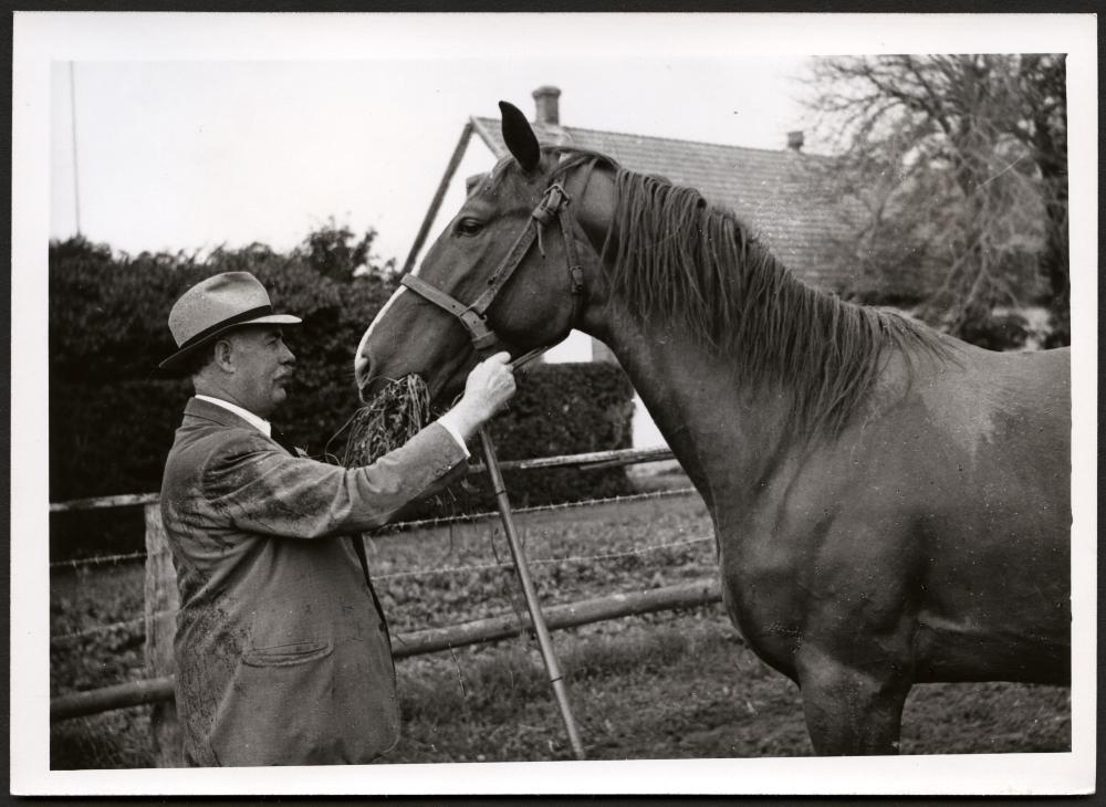 Bramstorp på semester. Statsrådet Axel Bramstorp fixar f.n. semester på sin gård i Södra Åby. Här hälsar han på märren "Lady".