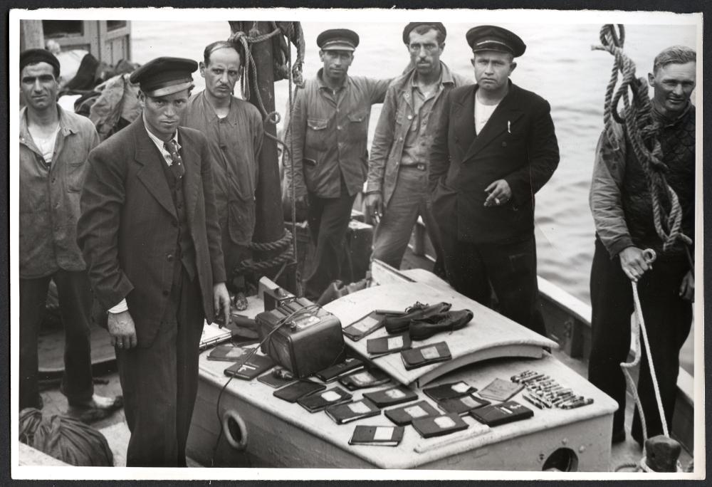 Bilden visar några av "Kosti"s besättningsmän vid sina tillhörigheter, såsom sjömans böcker, cigarrer m.m. vilka upplagts till torkning.