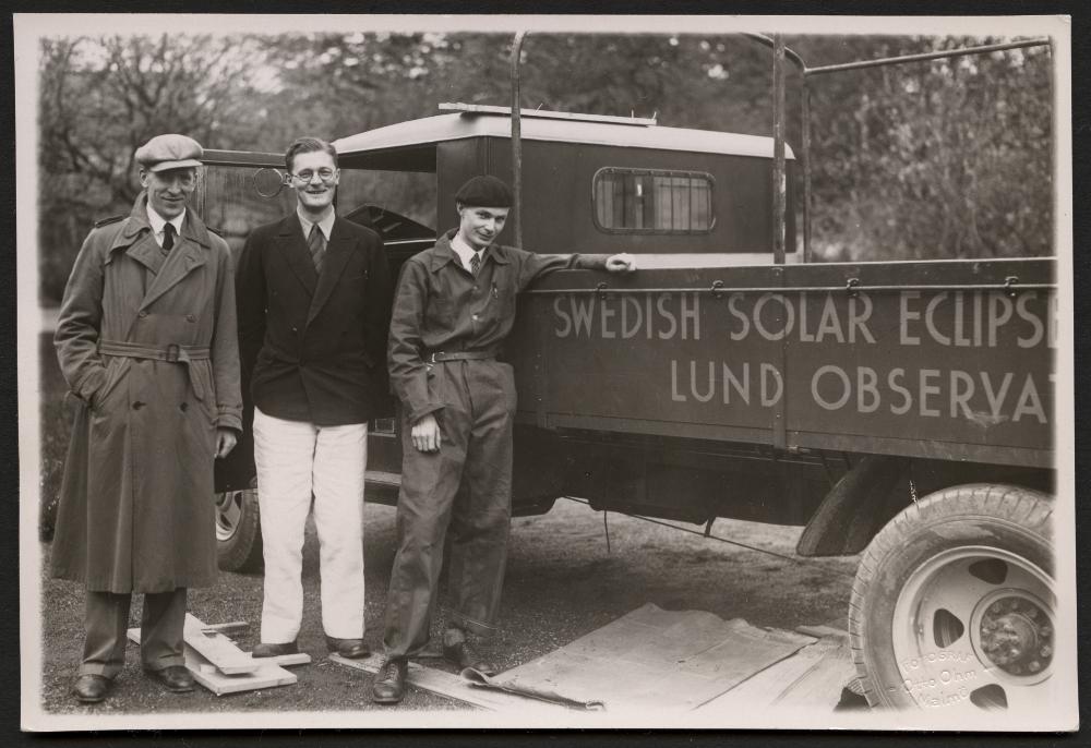 - Svenska Solförmörkelseexpeditionen till Ryssland. Expeditionen medlemmar samlade vid bilen i vilken resan skall företagas till Ryssland. Fr.v.: fil. lic. Björn Svenanins, fil. lic. Erik Holmberg och fil. mag. Karl Erik Forsman.