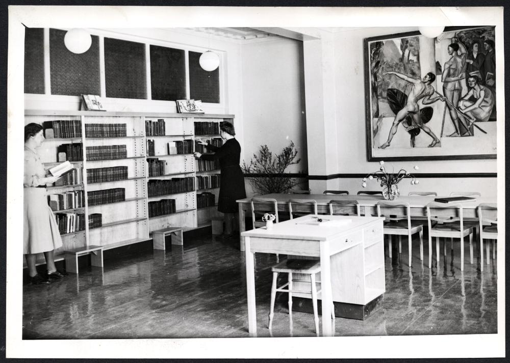 - Barnbibliotek i f.d. ölrestaurang, stadsbibliotek i Malmö har upprättat en ny biblioteksavdelning för barn och ungdom i en f.d. ölrestaurang i Folkets hus, bilden visar en interiör av den nya biblioteksavdelningen