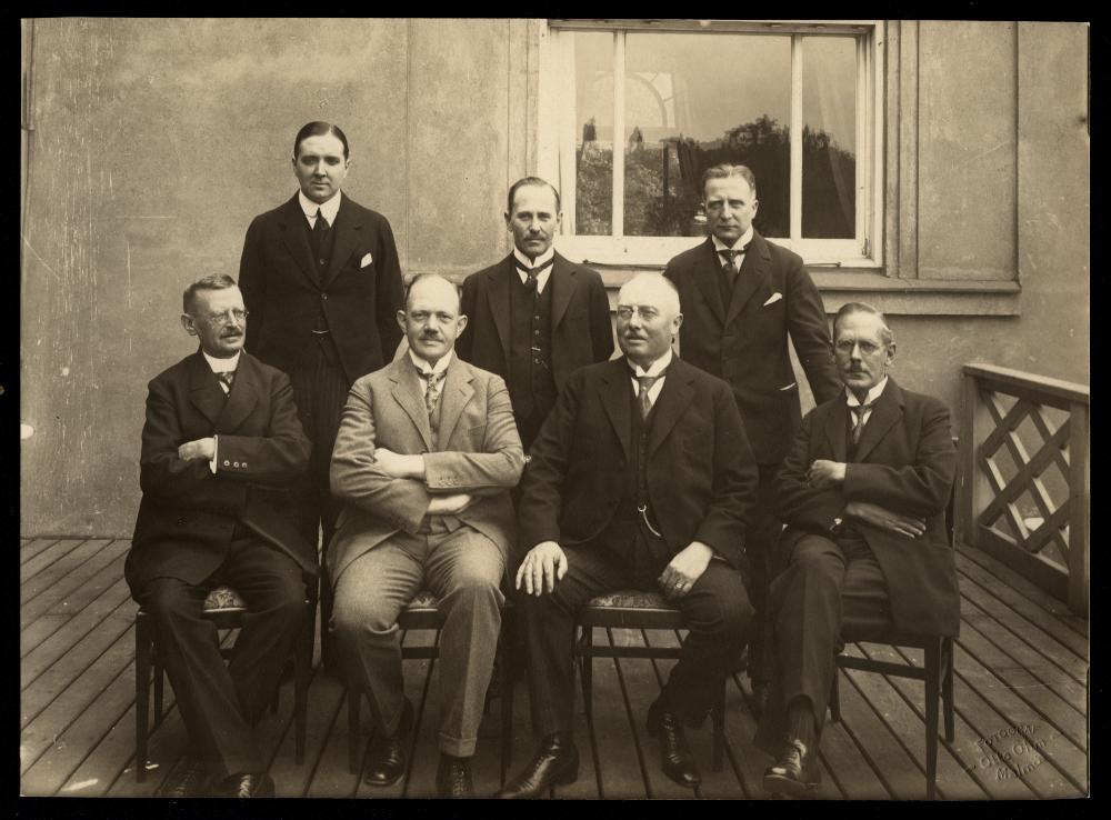 Lunds Lasaretts nya barn-sjukhus, sittande fr. höger: Doktor P Bergman, Lifmedicus professor Hedenius, Doktor Carlstein, Doktor Törnäll, stående fr. höger: Doktor Löfbeerg, Doktor Neander, Docent Perman.