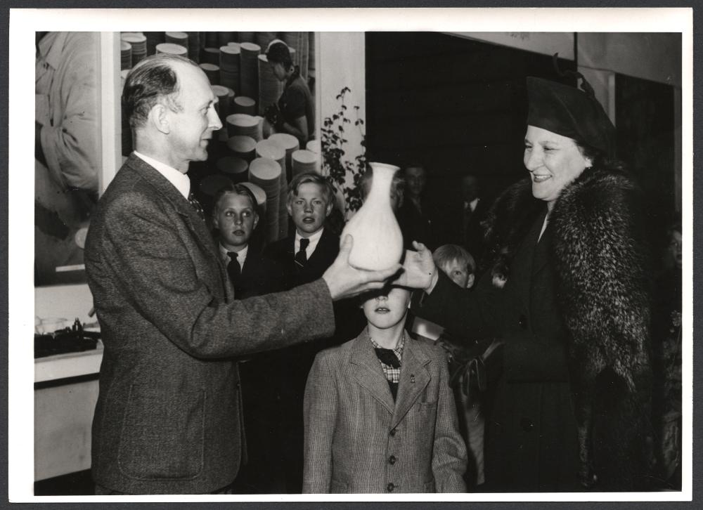 - Utställningssuccés. Den på Malmö Museum anordnade Rörstrandsutställningen har blivit stor succé. På Söndagen noterades de 10 000:de besöket av fru Maria Swedenborg, var vid en stengodsvas komponerad av Gunnar Nylund överlämnades. Bilden visar greve Sten Kalling överlämna minnesgåvan.