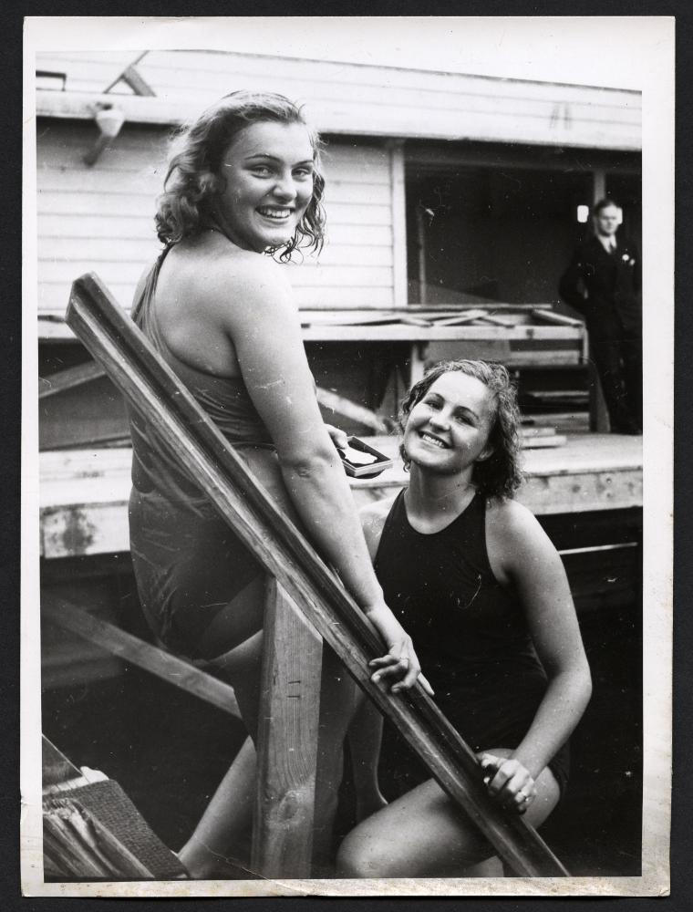 - S.M. i simning. De två främsta på 100 meter ryggsim för damer, mästarinnan Kerstin Åkerberg, IFK Stockholm, överst, och Kjerstin Sörensson, Malmö SS /tvåa/.