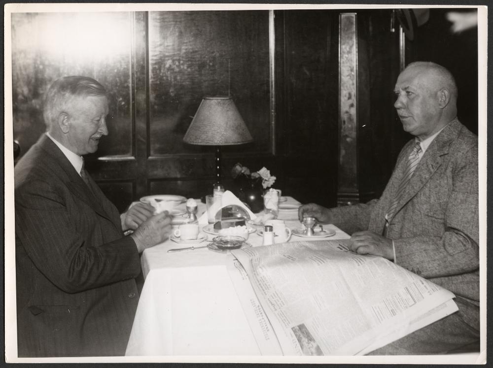 - Riksdagens Malmöbesök. Morgonmåltid på järnvägsrestaurangen, fr. v. : Andersson i Fältenberg, och landshövding Johan Nilsson.
