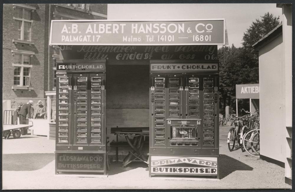Automater, frukt o. choklad. Automattillverkare ställer ut på Skånemässan. Petriskolans gård, Fersens väg, Malmö.