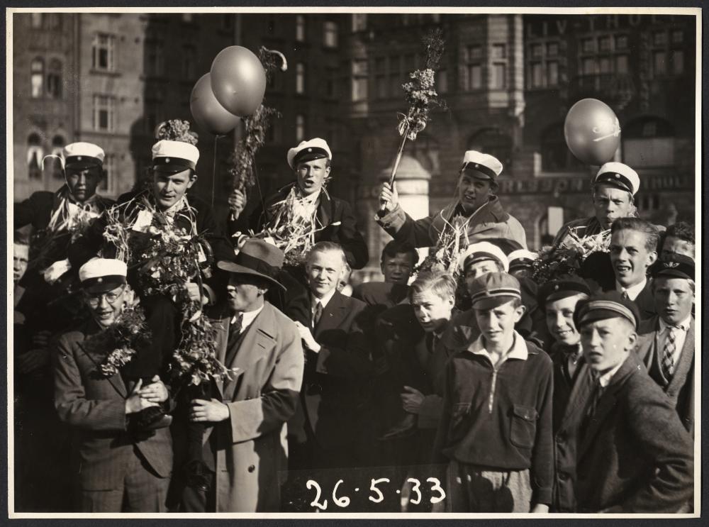 ROO 007153 :: pojke, studenter, blommor, studentmössa, ballonger, barn, man, ballong, blomma, män, firande, torg, student, pojkar, studentmössor, examen, studenten, studentfirande