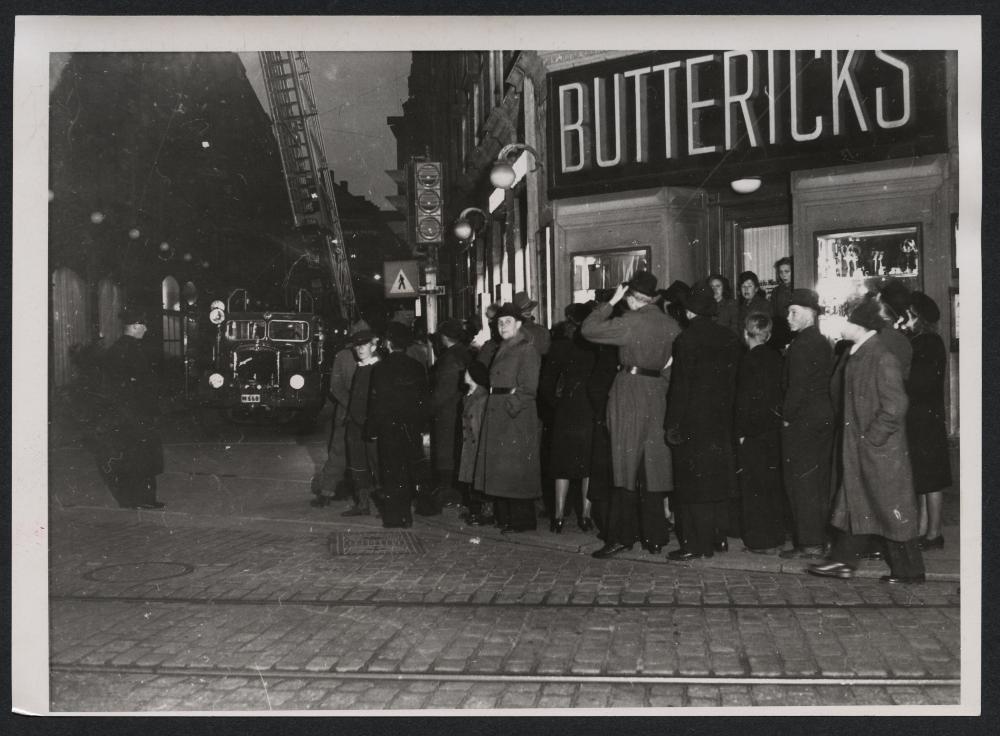 - Häftig orkan i Malmö. Den kraftiga blåsten hotade att på onsdagskvällen välta ett torn på fastigheten Södergatan 20, varför brandkåren alamerades för att med rep förstärka hållfastheten.Bilden visar en del av skådeslystna framför den utsatta fastigheten.