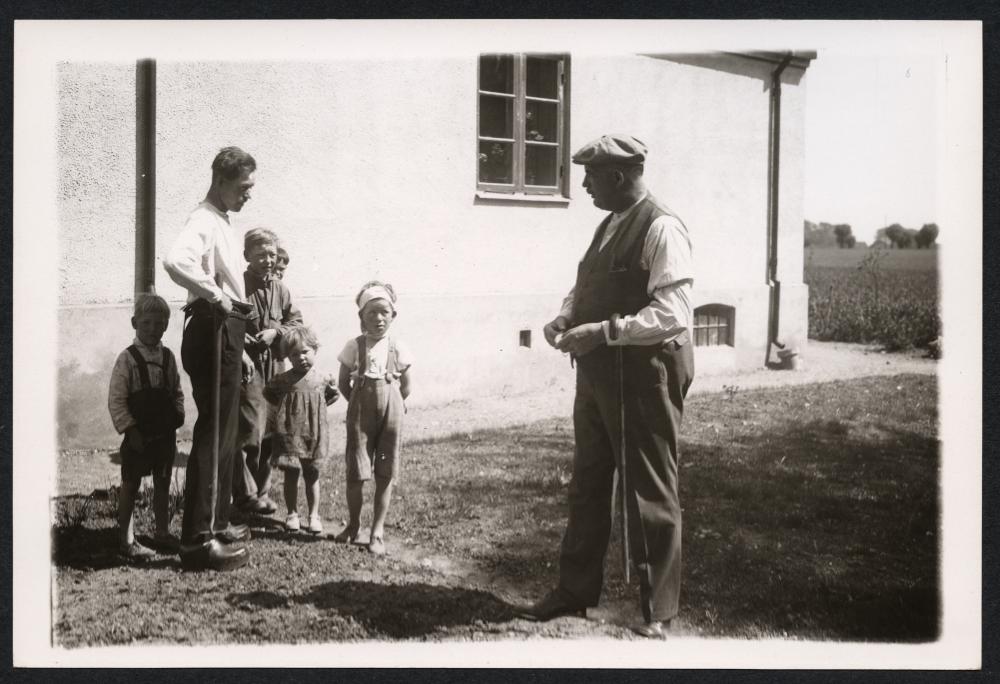 Statsministern firar midsommar. Excellensen Pehrsson Bramstorp i samtal med en statarefamilj på Isie boställe.
