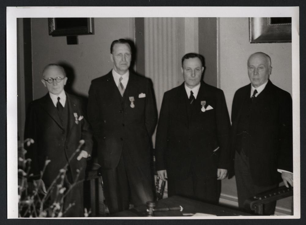 - Riksfröutställningen i Malmö. Svenska fröodlareförbundets guldmedalj överlämnades till från vänster: direktör Einar Trotzig, Linköping, direktör John Palmér, Örebro, och konsulent Linder Aronsson genom greve Philip Bonde till höger.