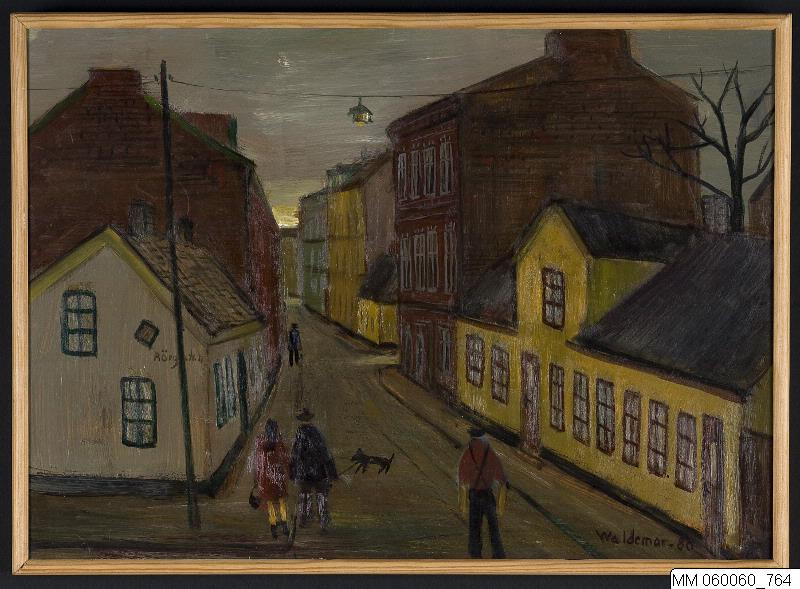 - Vi befinner oss i hörnan Rörgatan / Södra Långgatan på Lugnet och vänder blicken åt väster. Vi ser Södra Långgatan sträcka sig i centralperspektiv snett in mot bildens mitt. T.v. i förgrunden syns Rörgatan med gaveln på hörnhuset i kv Renen och följande rödtonade hyreshus i två eller tre våningar. T.h. i mellangrunden mynnar Östra Långgatan ut mellan kv Näktergalen och kv Pantern. Närmast t.h. en lång gultonad envåningslänga med murad vindskupa på taket av svart tjärpapp. Därefter ett rödtonat hyreshus i tre våningar med en brandgavel som sträcker sig djupt in i kvarteret. I nästföljande kv Pantern syns det gulputsade hörnhuset mot Östra Långgatan och därefter två intilliggande trevåningshus i gul resp. grön puts. Efter dessa hus syns en tvärsgående gata som bör vara Västra Långgatan, om än perspektivet förefaller lite underligt - Södra Långgatan har på kartan en nästan helt rak sträckning och sikten borde vara fri fram till Södra Förstadsgatan. I målningens förgrund syns ryggtavlan på tre personer, t.v. ett flanerande par med en hund i koppel och mitt ute i gatan en man med uppkavlade ärmar och svarta byxor med korslagda hängslen. Längre fram i höjd med Östra Långgatan syns ytterligare en flanerande person. T.v. i förgrunden syns också en ledningsstolpe och över Södra Långgatan hänger en gatubelysningslampa. Det är kväll och solen sänker sig i väster men gatubelysningen är ännu inte tänd.