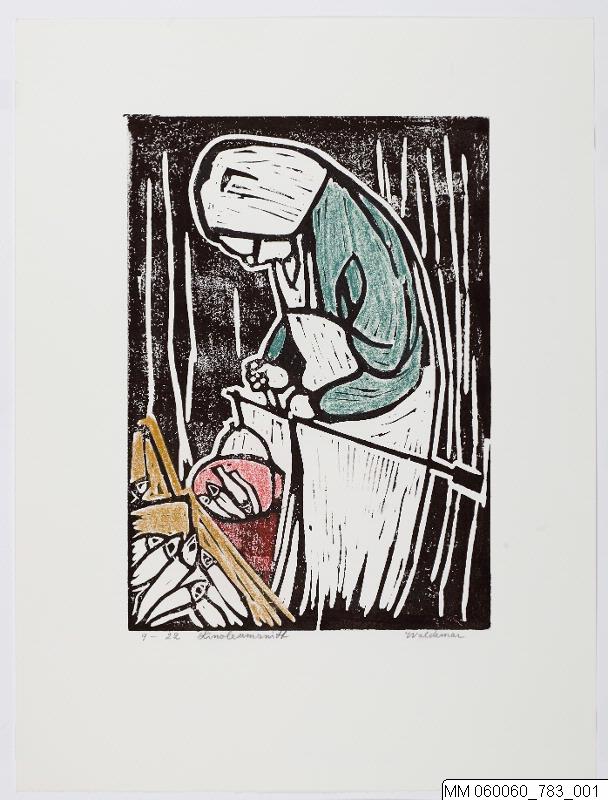 grafik, linoleumsnitt, handkolorerat