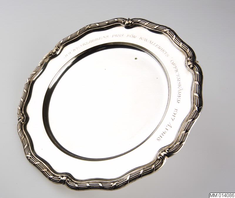 Tallrik av silver, å brädden graverad inskrift: Jockeyklubbens pris för vkavalleriets officerskårer 1917. 1 pris. Stämplar: C. G. HALLBERG (avritade stämplar) och, S Q7