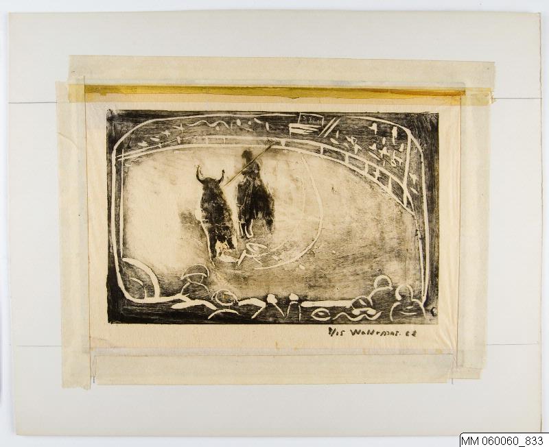 - Motivet är hämtat från en resa till Spanien och visar en tjurfäktning i Palma. Arenan följer bildens kanter i ett mörkt band runtom, med grovt skurna linjer och antydan om publik. Mitt på arenan syns en ridande picador stöta sin lans i tjurens nacke.