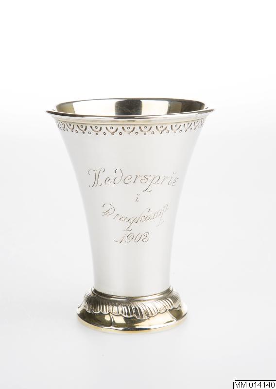 Bägare av silver, invändigt förgylld. Med graverad inskrift på sidan:
