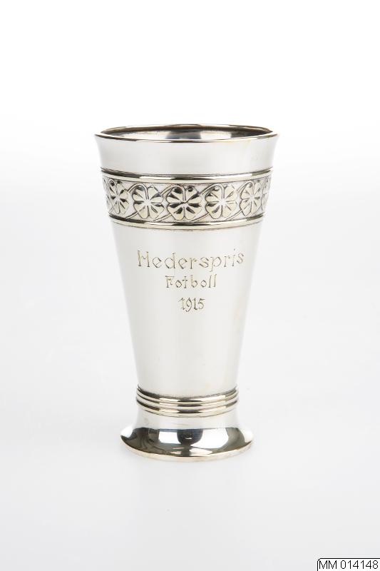 Bägare, av nysilver, upptill med pressad bård. Ingraverad inskrift på sidan: Hederspris Fotboll 1915