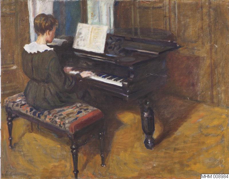 - Bilden föreställer en ung kvinna som spelar piano. Vi ser hörnet av ett rum med mörk träpanel på väggarna och t.v. ett fönster med vita gardiner. Det svarta pianot är placerat i hörnet intill fönstret, flickan är avbildad snett bakifrån, sittande på en pall, det mellanbruna golvytan i förgrunden är tom. Mot pianots notställ lutar sig ett vitt, uppslaget nothäfte. Flickan är klädd i en mörkt grön fotsid klänning med vit krage kring halsen. Håret är uppsatt i en knut och lämnar halsen bar. Hon håller båda händerna på klaviaturen och blicken riktad mot nothäftet. Pianopallen är av polerat trä och har en färgrikt mönstrad sittdyna.