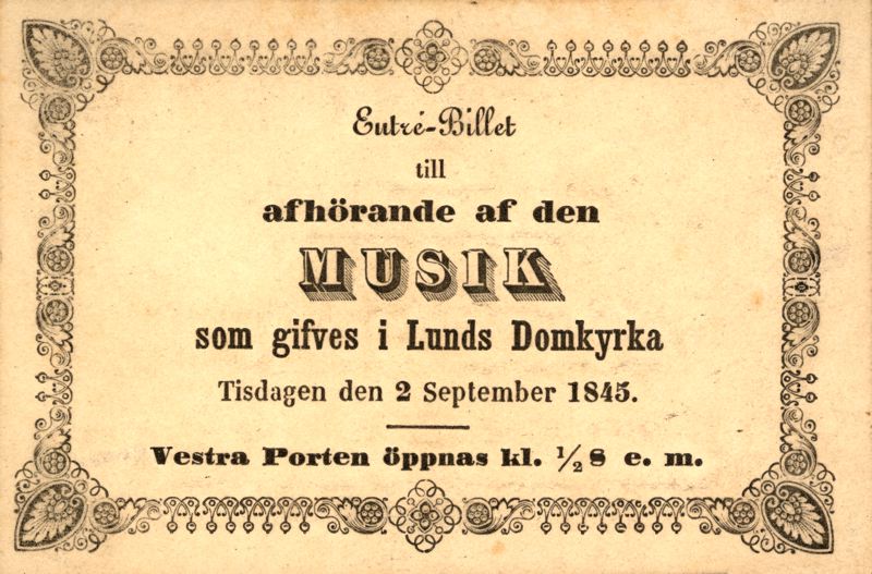 Entrebiljett till konsert i Lunds domkyrka på vitt papper med svart
