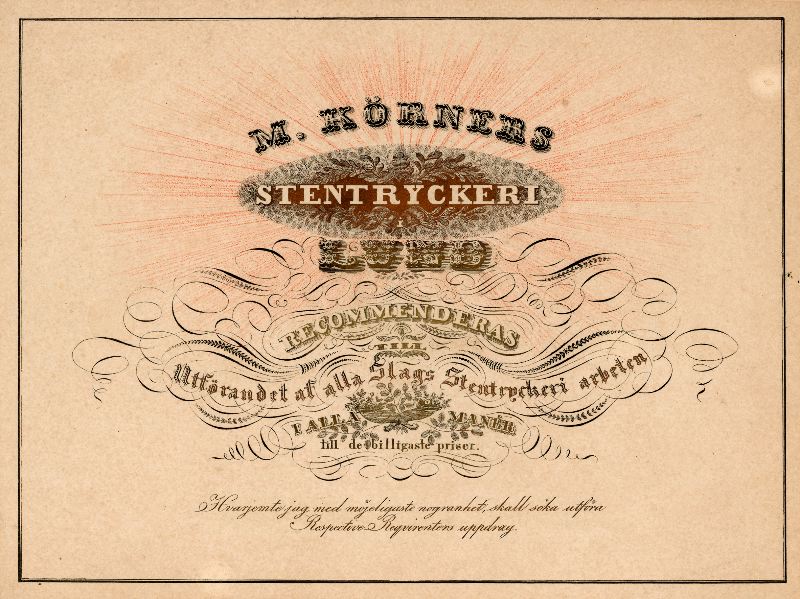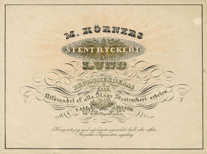 Text: M. KÖRNERS / STENTRYCKERI 7 LUND 7 RECOMMENDERAS / TILL / Utförandet af alla Slags Stentryckeri arbeten / I ALLA MANÉR / till de billigaste priser / Hvarjemte jag med möjeligaste nogranhet, skall söka utföra / Respective Reqvirenters uppdrag.