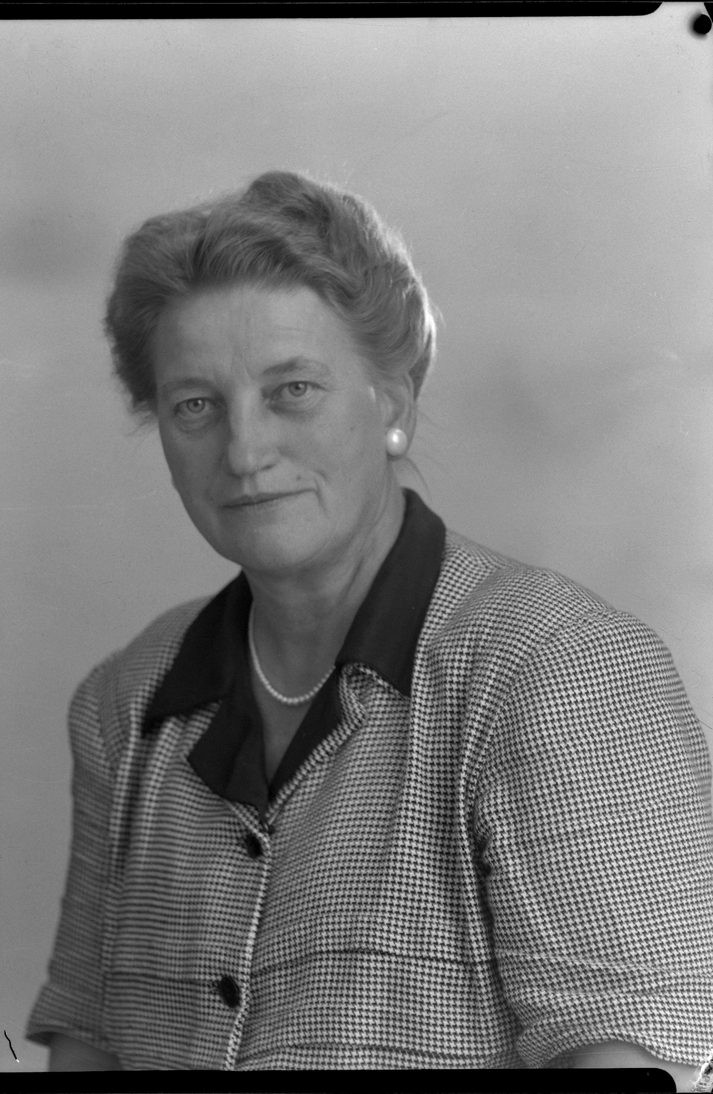 Dam i 60-årsåldern i rutig klänning med vit krage, närbild