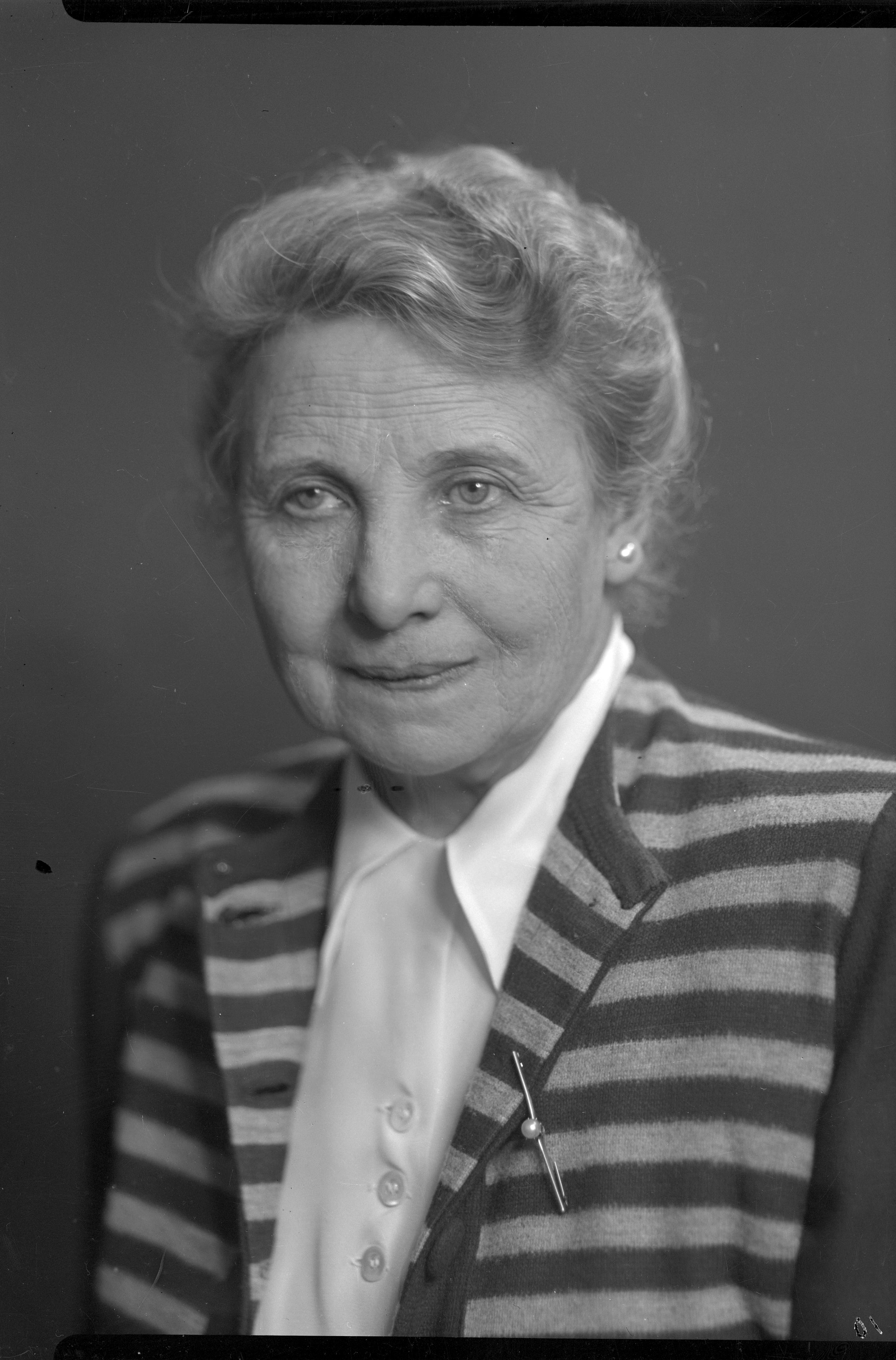 Dam i 75-80-årsåldern i blus och randig jacka