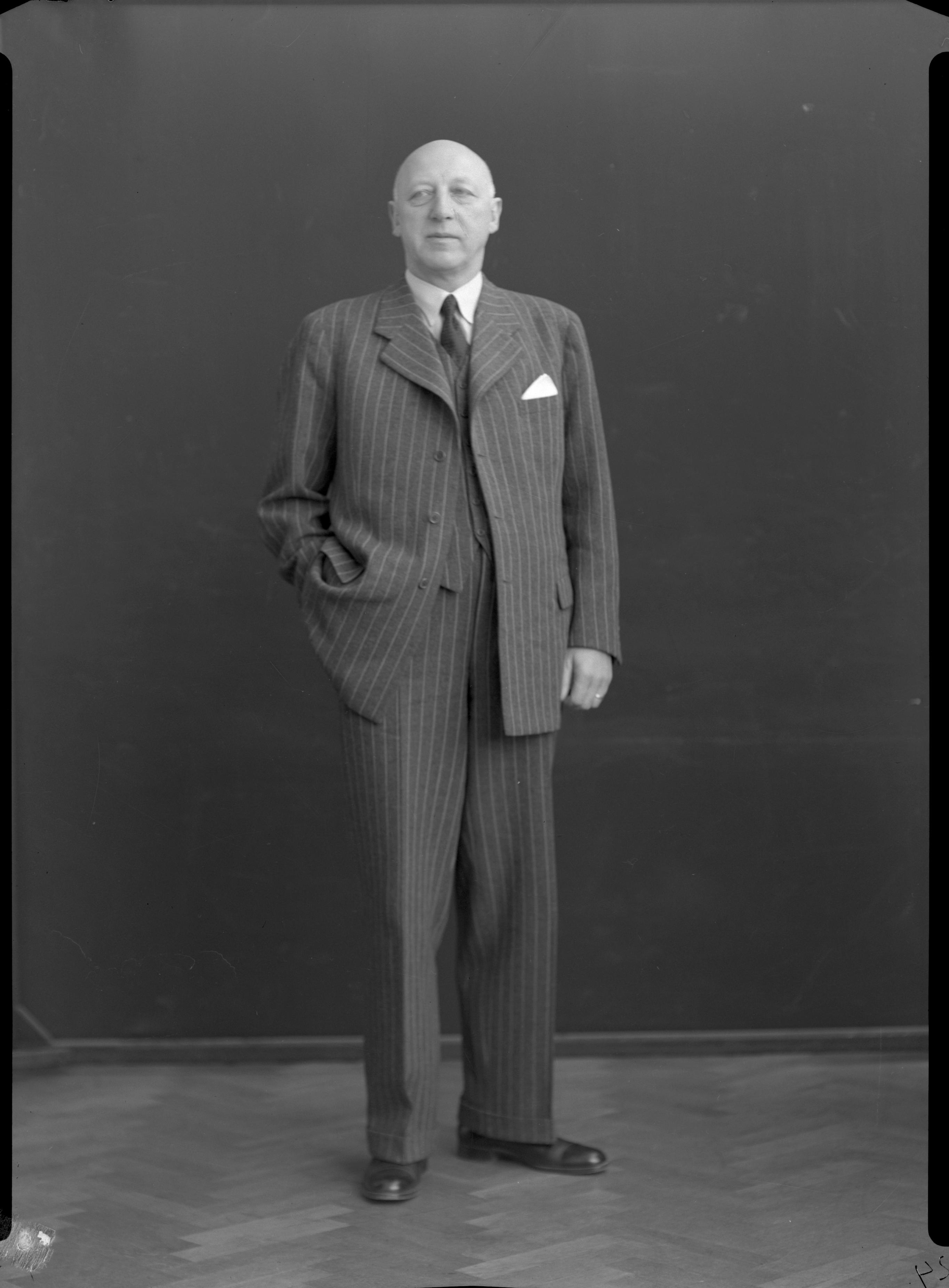Man i 70-årsåldern i randig kostym, helfigur