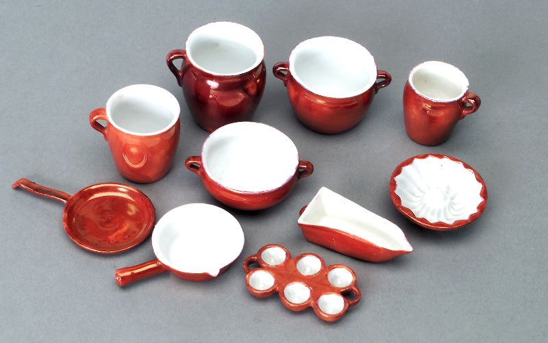 Servis av kökskärl för dockor, porslin, på utsidan röd lysterglasyr,