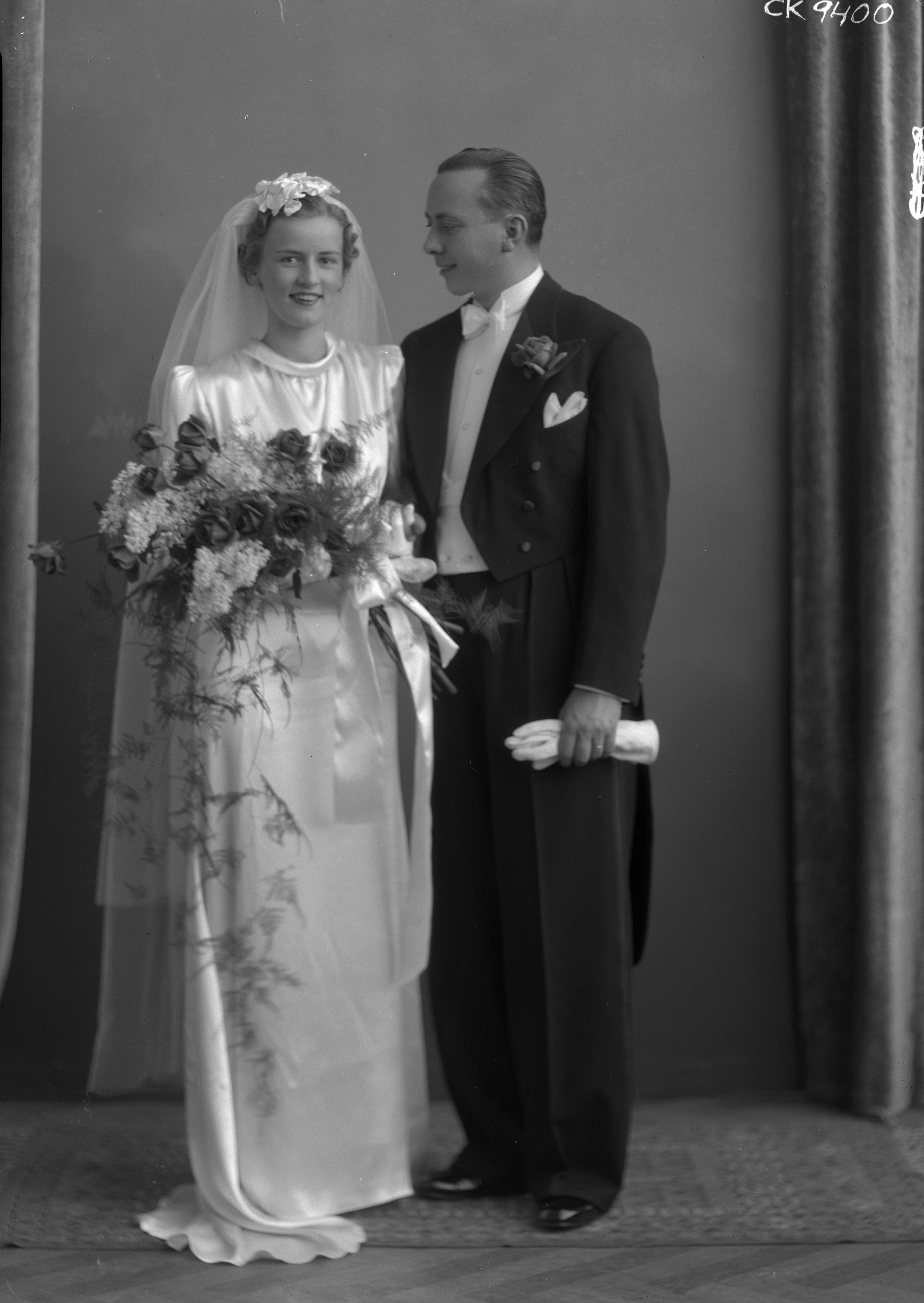 CK 009400 :: brudgumsklädsel, brudklänning, blombukett