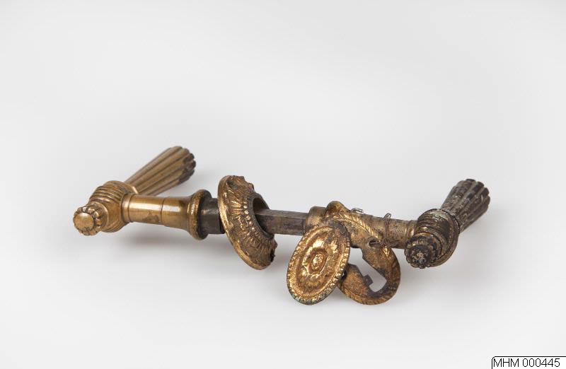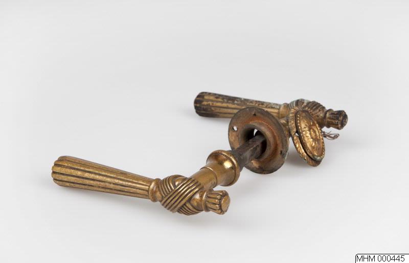 Låsvred, mässing, samt nyckelskylt av förgyllt mässing. Från