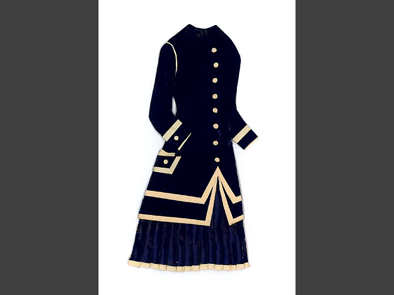 Dock-klänning, gjord av glanspapper, tyg, färglagt tryck m.m.