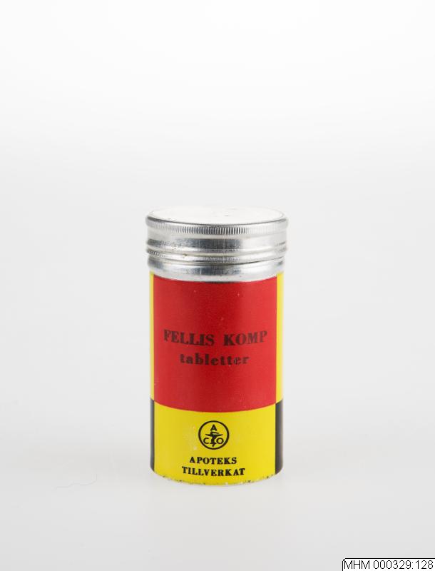 Pillerburk av plåt med skruvlock. Text: "Fellis komp / tabletter / ACO / Apoteks / tillverkat / 100 tabletter / Varje tablett innehåller / Extr. bellad. 5 mg / Extr frangul. 30 mg / Extr. aloes 100 mg / Extr. fellis bov. 50 mg / Användes enligt läkares ordination / Förvaras oåtkomligt för barn. På- / skriften får ej avlägsnas, utplånas / eller eljest göras oläslig."