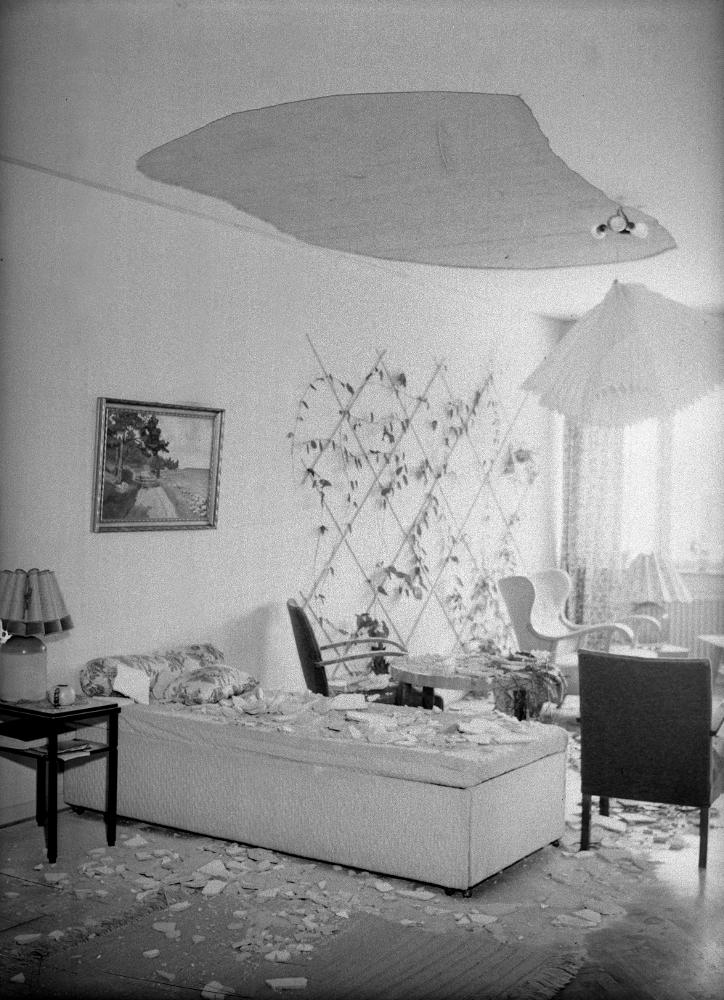 Inomhusbild som visar ett takras i ett vardagsrum i Malmö ifrån mars 1947.