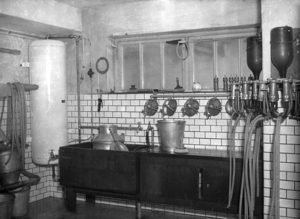 Inomhusbild från Norra Lindholmens gård i Svedala föreställande mjölkkannor. Bilden är tagen 1944.