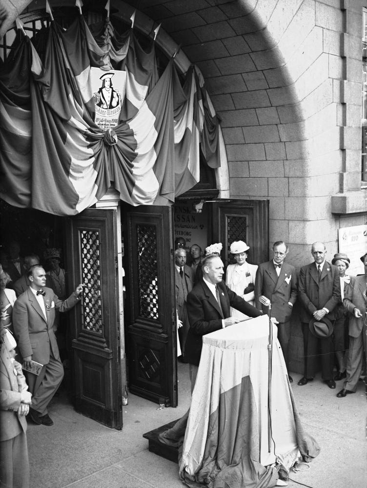 Utomhusbild tagen 1946 under Skånemässan. Okänd man som håller tal inför åhörare.